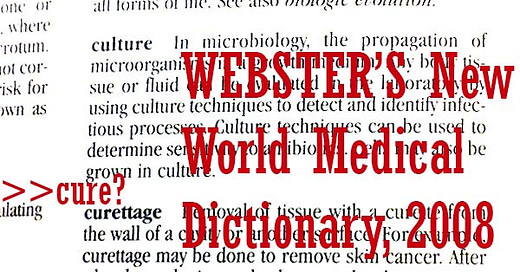 In 2016, I discovered that Webster's New World Medical Dictionary jumps from culture to curretage, but has no definition for the words cure, cured, cures, nor even incurable. I thought it was an exception. I was wrong. It's the rule. I now maintain a growing list of medical dictionaries that don't define cure, cures, curing, cured, or incurable. For example,
