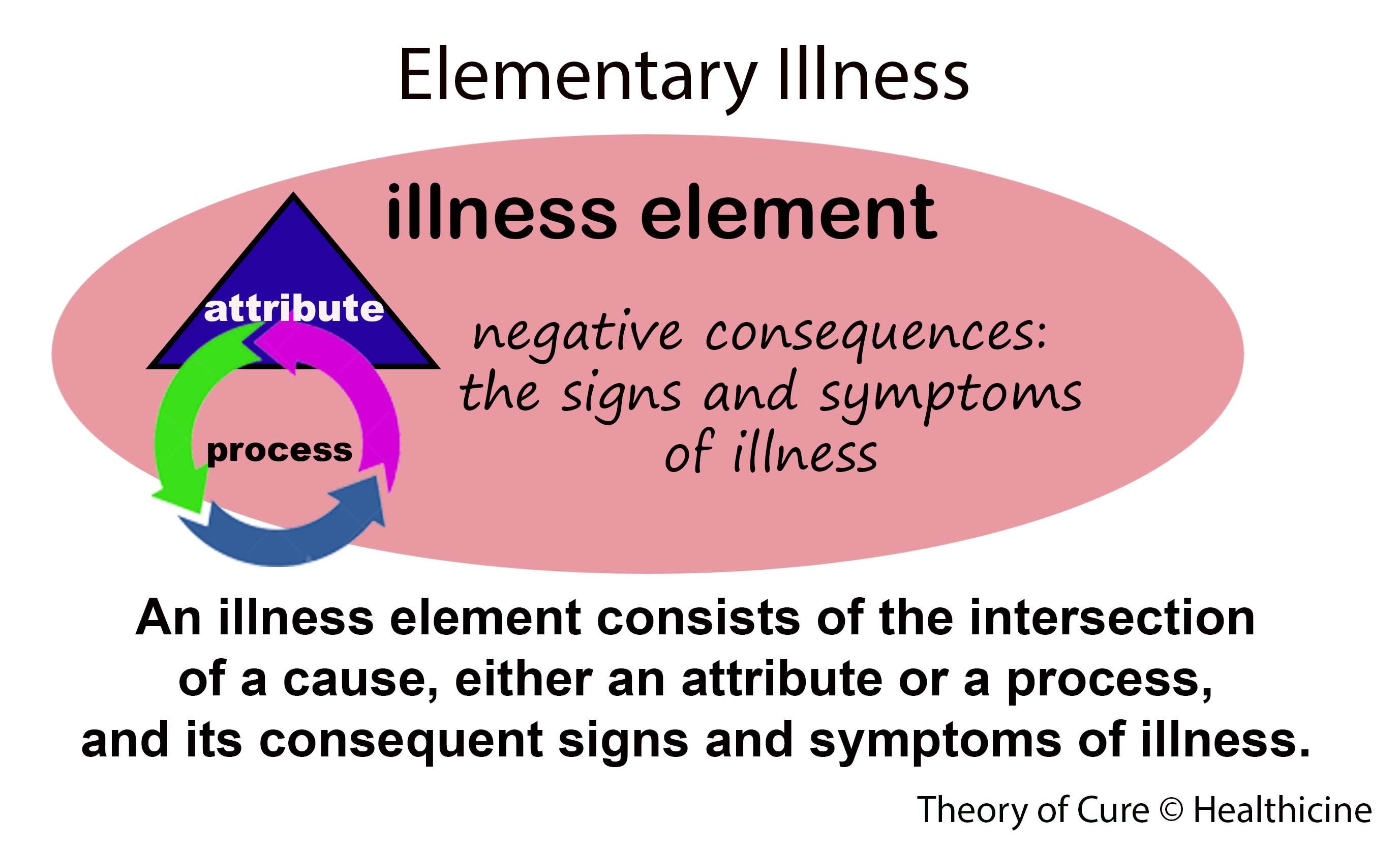 The cure-cause of an element of illness, or an elementary illness can be either a noun or a verb. The cause (or its absence) is present and seen as causing (not “having caused”) the illness state, such that when the cause is successfully addressed, the illness disappears.
